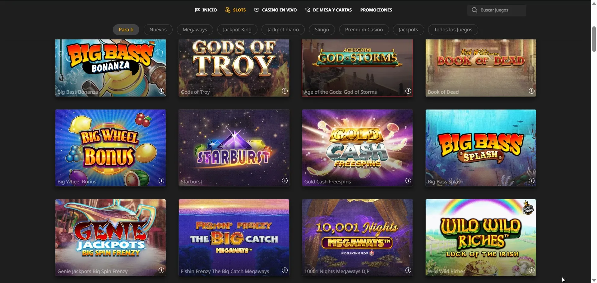| Pragmatic Play | Slots y Live (versión Live restringida) | Muchas tragaperras populares listadas (Gates of Olympus, Big Bass Bonanza). |